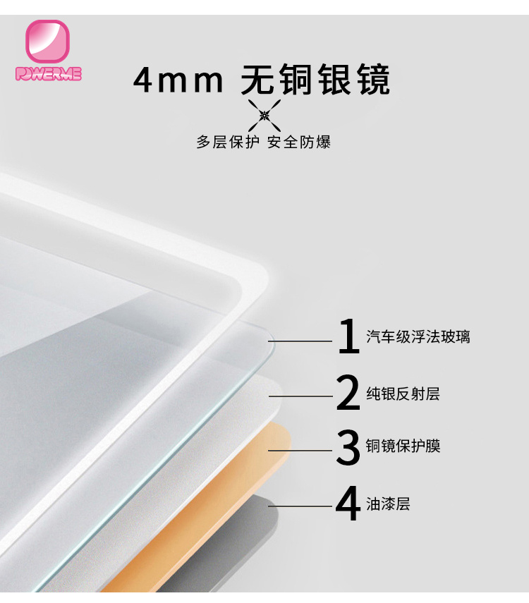 2.環保無銅鏡面,浮化玻璃,帶有拋光邊緣保護手指,4毫米厚度,適用于高濕度位置使用